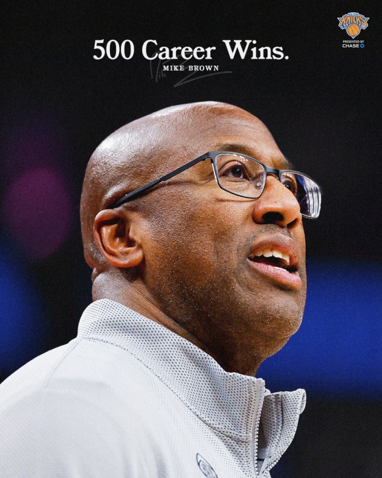 这是主教练迈克·布朗教练生涯的第500场胜利,球队官方晒图祝贺。